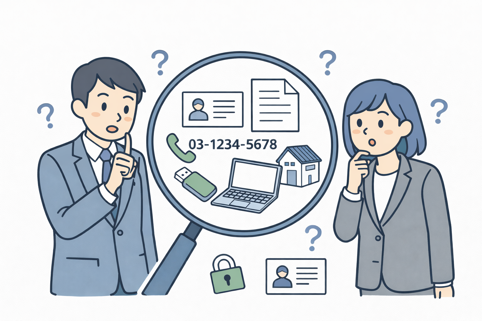 個人情報とは、「生存する個人を特定できる情報」のことをいいます。たとえば、氏名、住所、電話番号、メールアドレス、生年月日などはその代表例です。